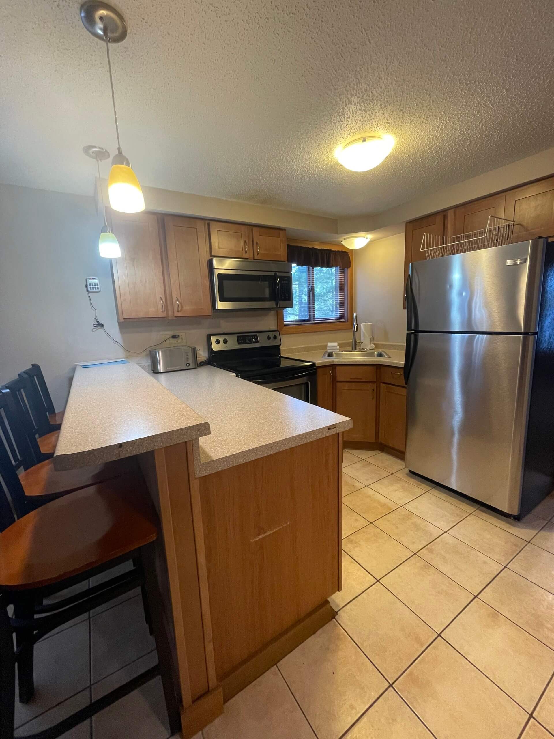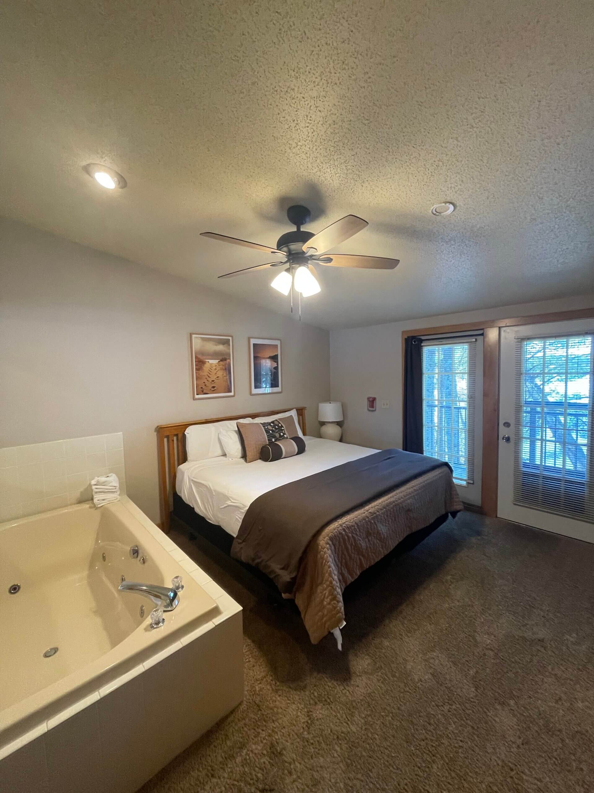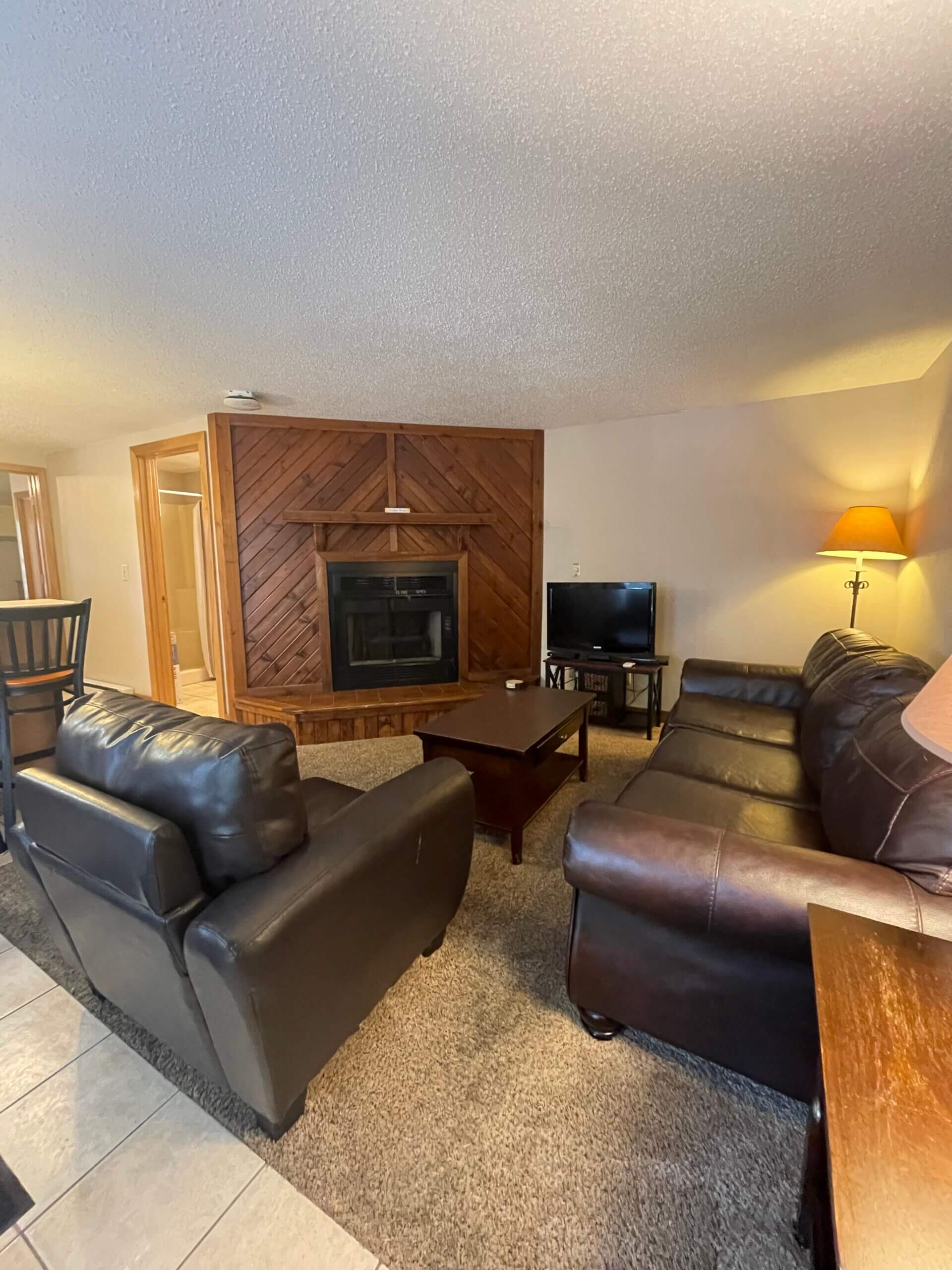 New Rental!! Lakefront 2 bedroom, 1 bathroom upper level condo. Full kitchen stocked with cooking ware and utensils. Cozy living room features a fireplace and smart TV. Guest bedroom has a full size bed and twin size bunk bed. Master bedroom has a king bed, TV, jacuzzi and access to the balcony. Sleeps 6.