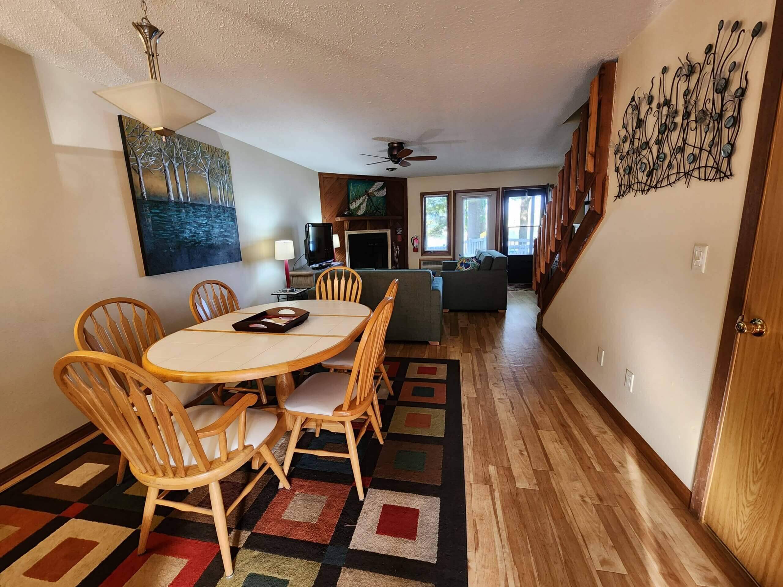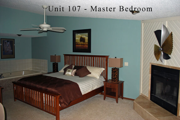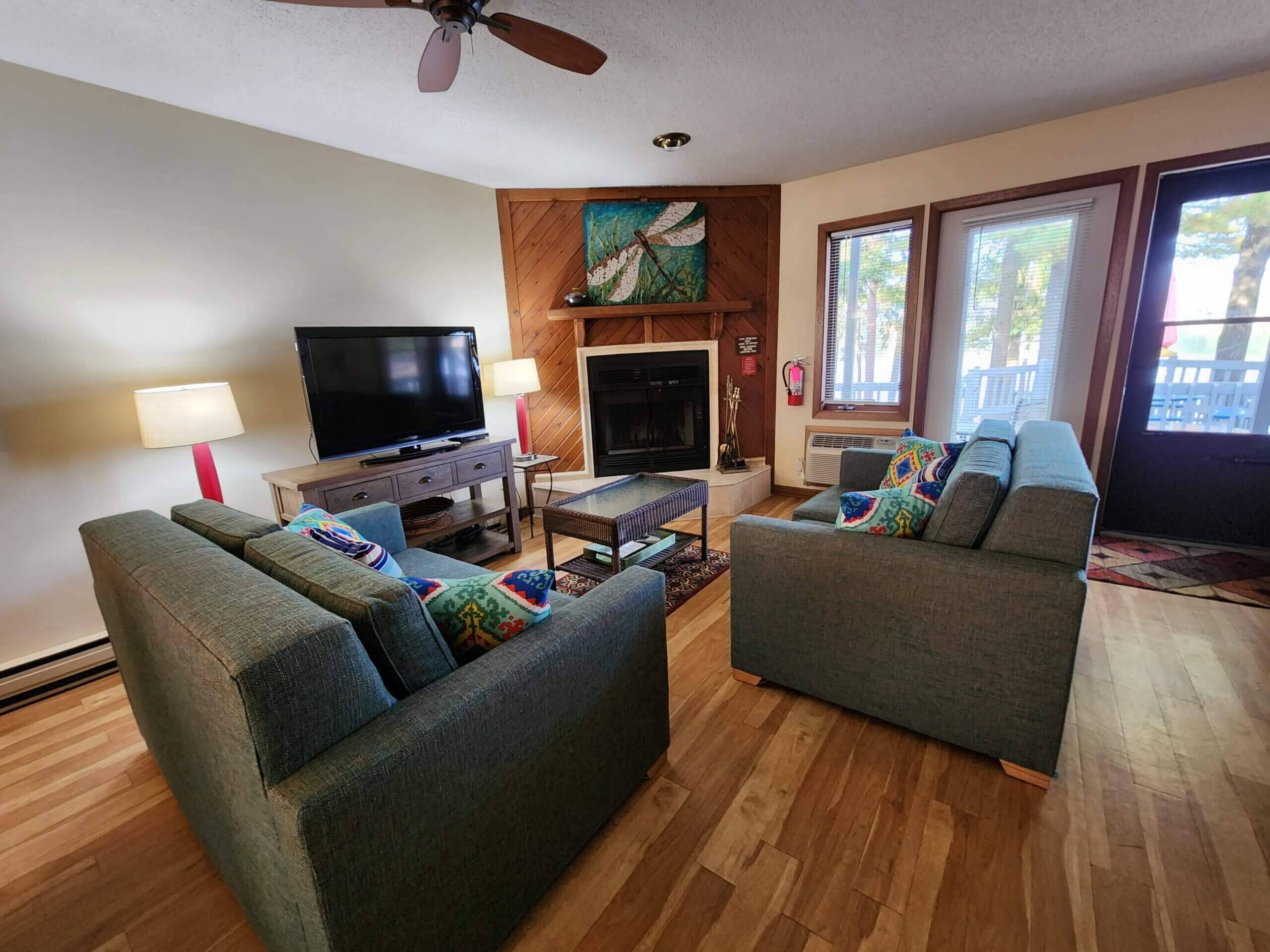 Lakefront 2 bedroom, 2 bathroom townhouse. Full kitchen is stocked with cooking ware and utensils. Cozy living room features a fireplace, 2 twin sofa sleepers, TV and access to the deck. The master bedroom features a fireplace, king bed, TV, jetted tub, ceiling fan and balcony access. Second bedroom has a queen bed, TV and ceiling fan. Sleeps 6.