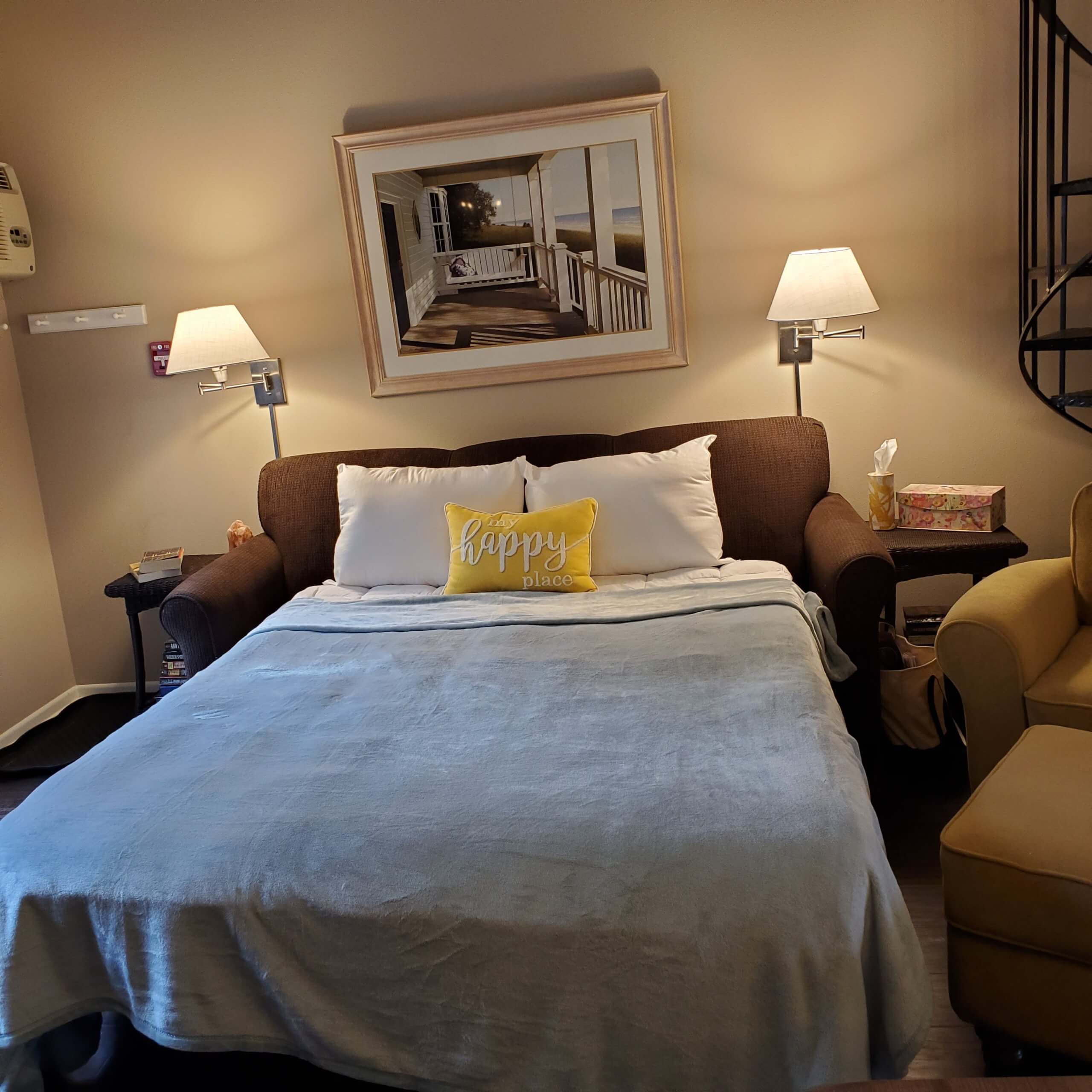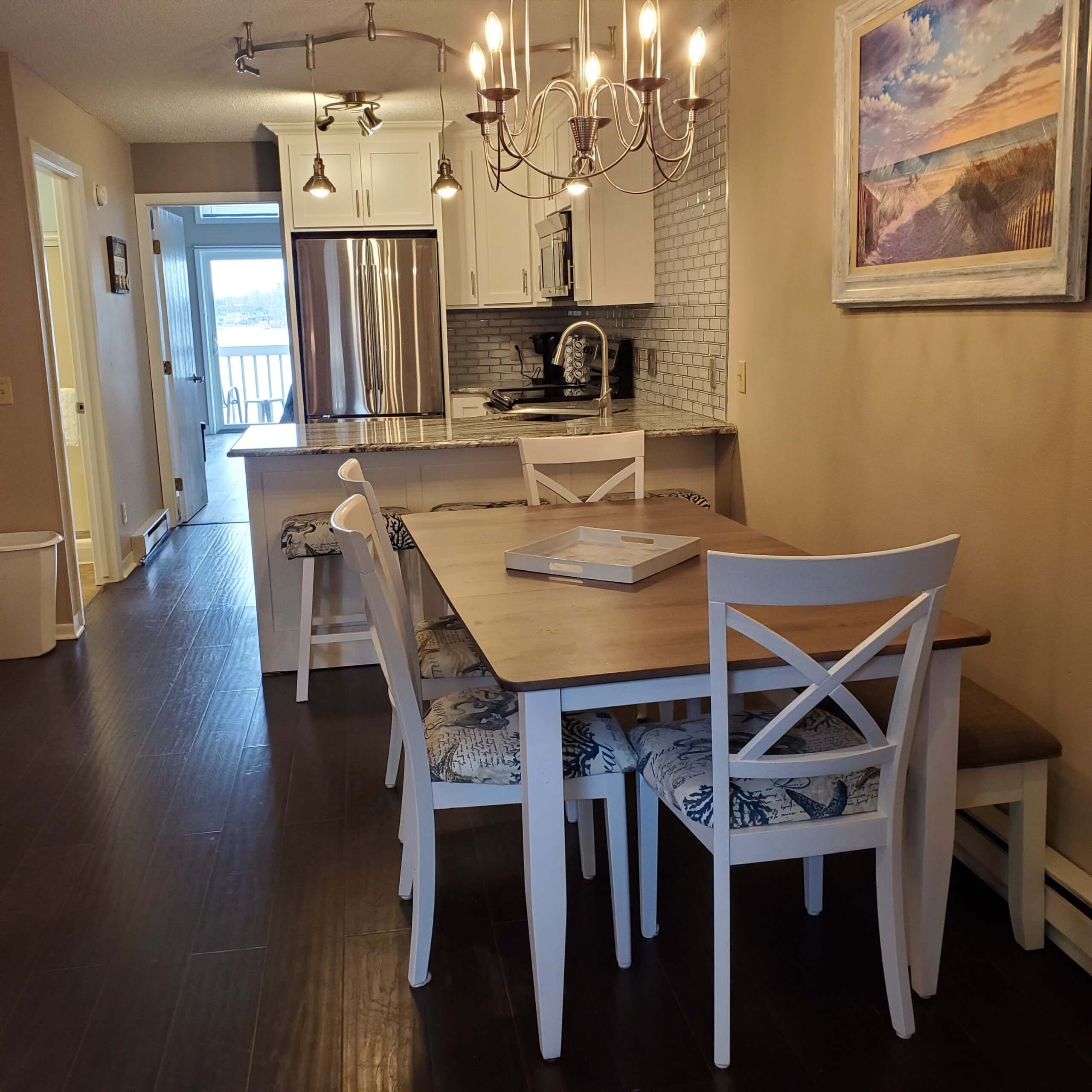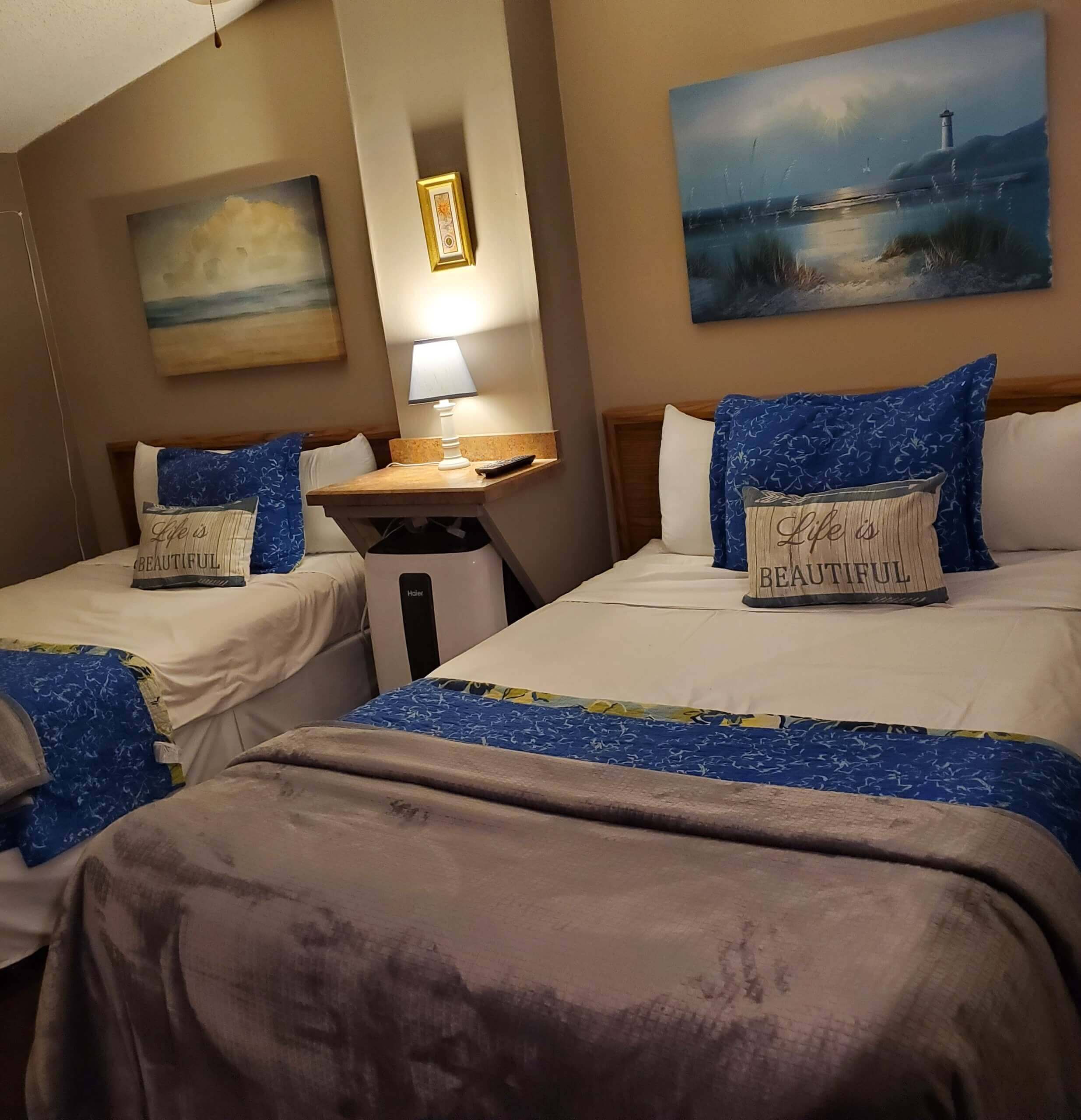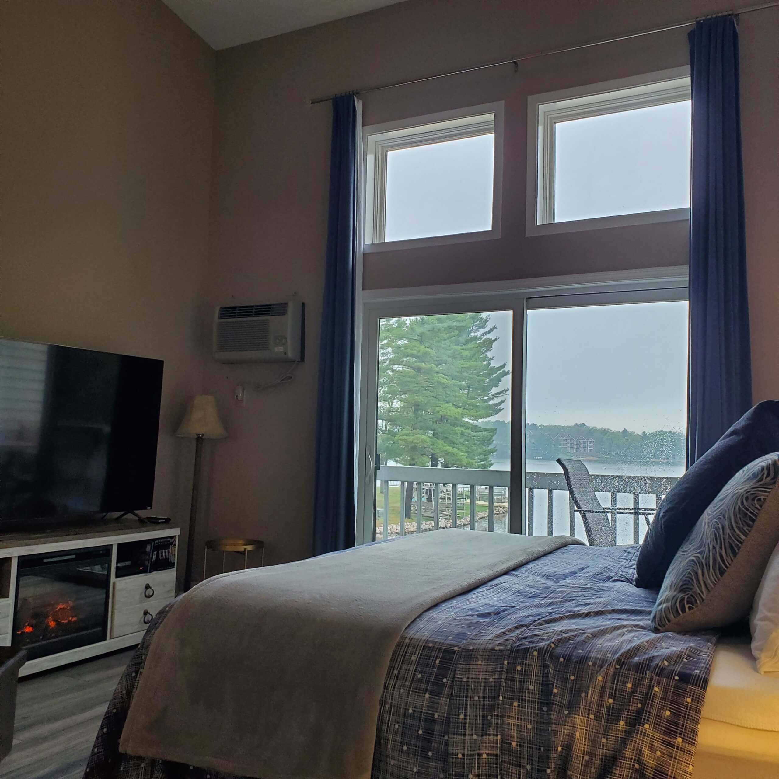Newly remodeled!! Lakefront 1 bedroom, 2 bathroom upper level condo with a loft. Full kitchen with a dishwasher is stocked with cooking ware and utensils. Cozy living room features a fireplace, large TV and queen sofa sleeper. The master bedroom has a king bed and full sofa sleeper. Loft area has two full size beds, TV and private bathroom. Sleeps 8.